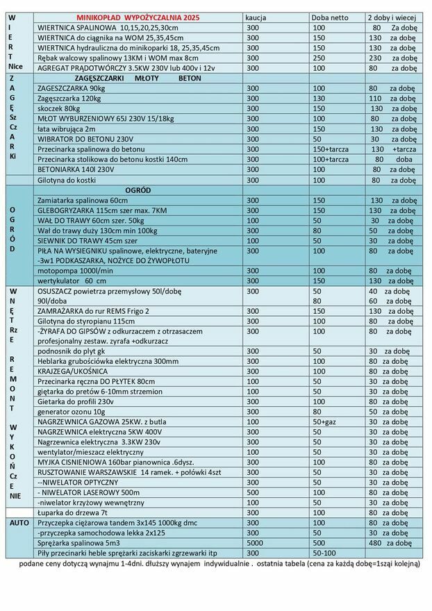 WYNAJEM sprzętu budowlanego możliwość wynajmu w późnych godz wieczornych i w weekendy.